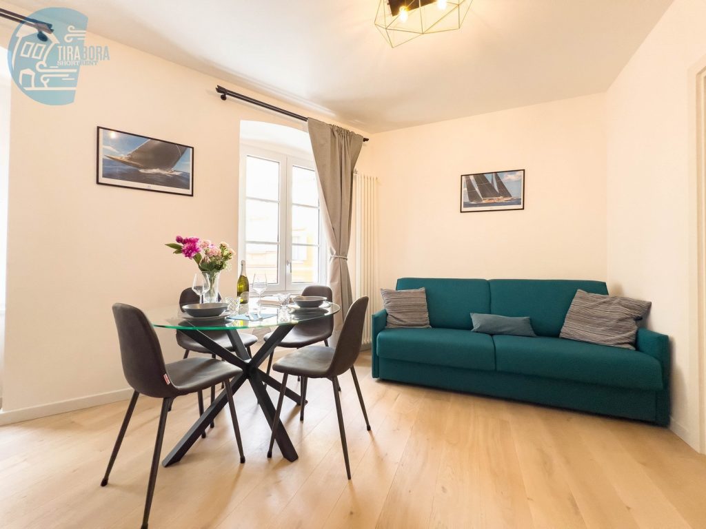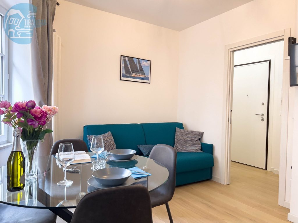 Il soggiorno è arredato con gusto e offre un ambiente ideale per rilassarsi dopo una giornata trascorsa a esplorare la città. Il confortevole divano, che si trasforma in divano letto, vi invita a distendervi e godervi un buon libro o guardare un film sulla Smart TV a schermo piatto.