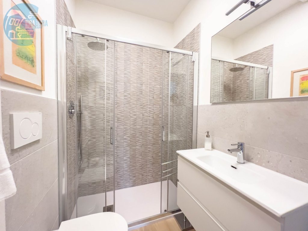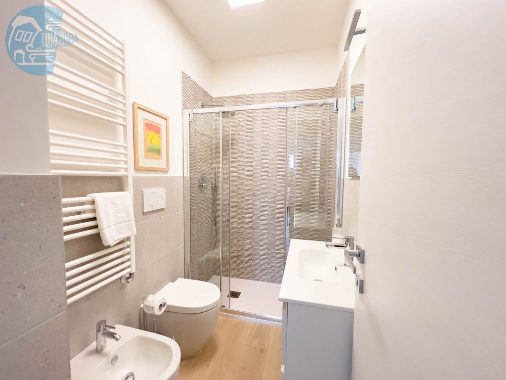 Il bagno è moderno e elegante, completo di una spaziosa doccia, asciugamani soffici e articoli da toeletta di qualità.