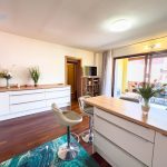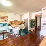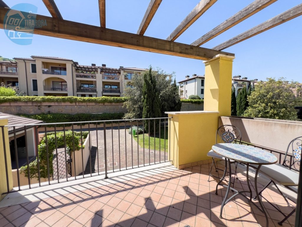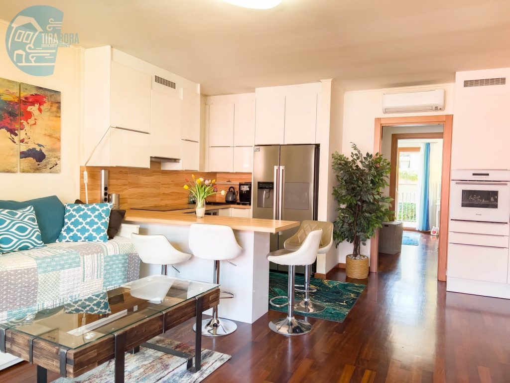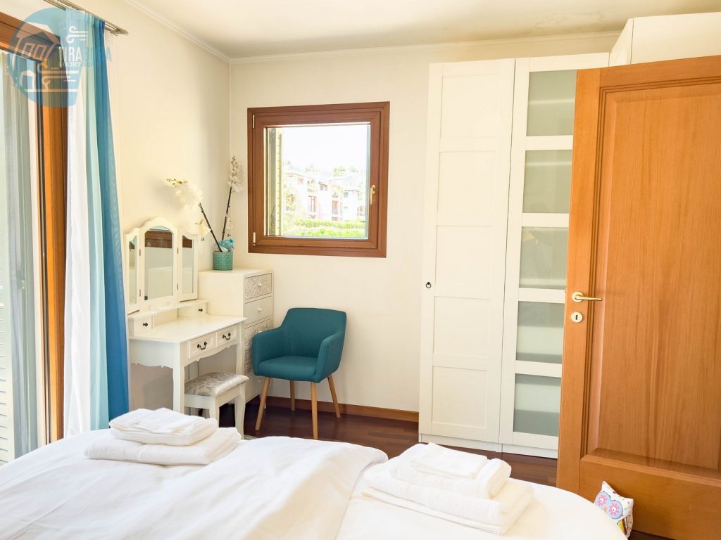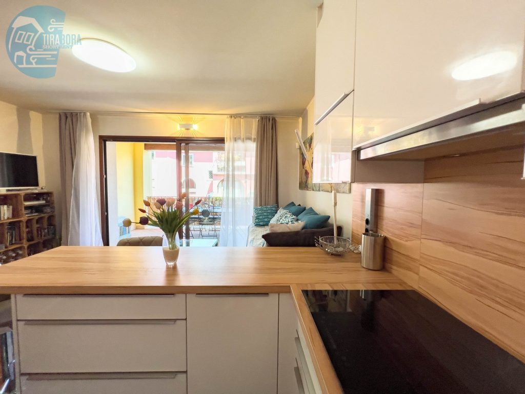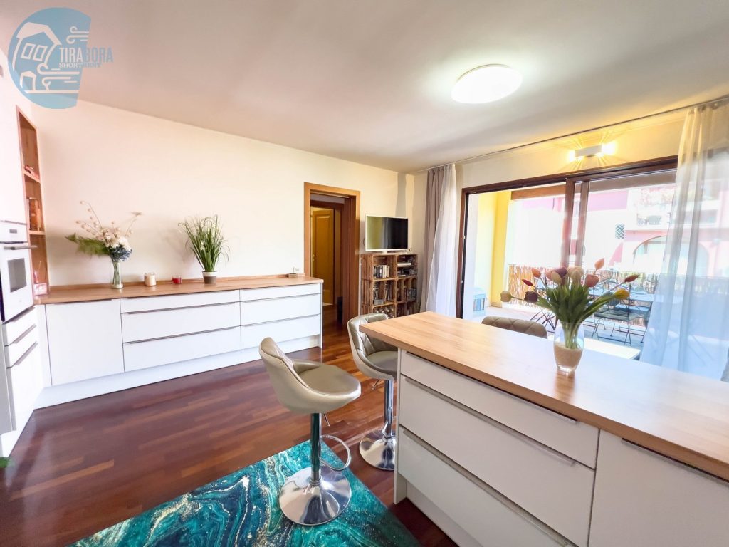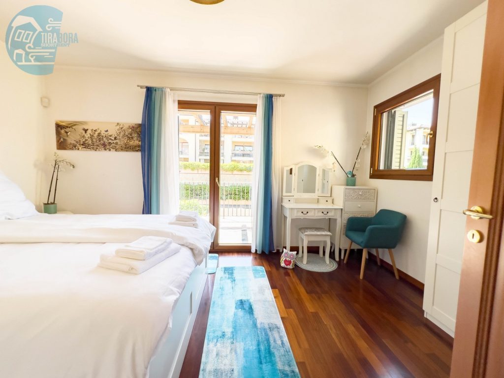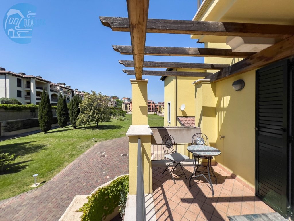 L’appartamento dispone di due camere da letto matrimoniali, entrambe arredate con gusto e design moderno. La camera principale si apre su un accogliente terrazzo, ideale per iniziare la giornata con una colazione immersi nel verde e nella tranquillità. Nel soggiorno, troverete un angolo cottura completamente attrezzato, perfetto per preparare deliziosi pasti, e un secondo terrazzo spazioso, attrezzato per godere di pranzi, cene o colazioni all’aperto. Per ospiti aggiuntivi, il comodo divano letto in soggiorno può facilmente trasformarsi in un letto per due.