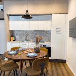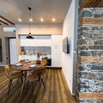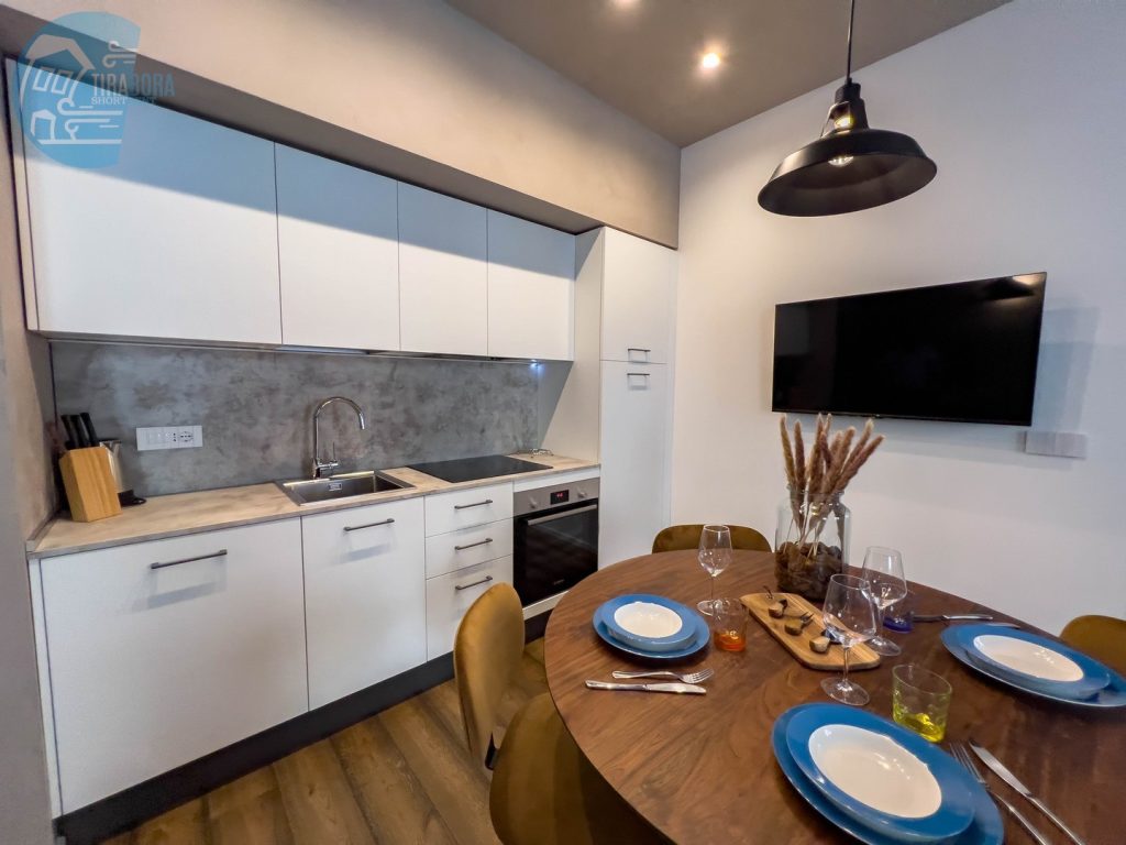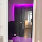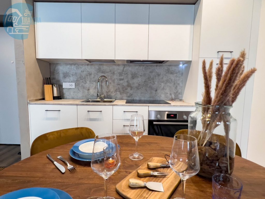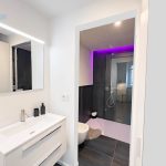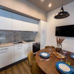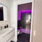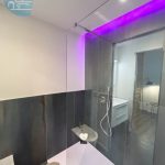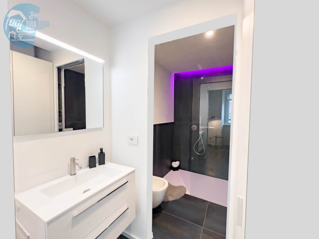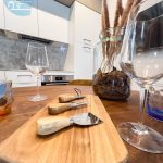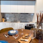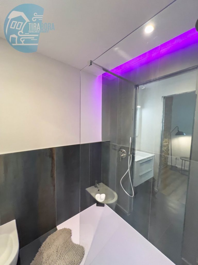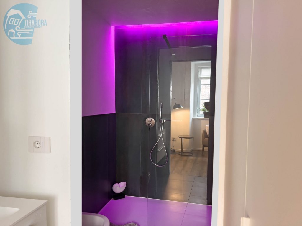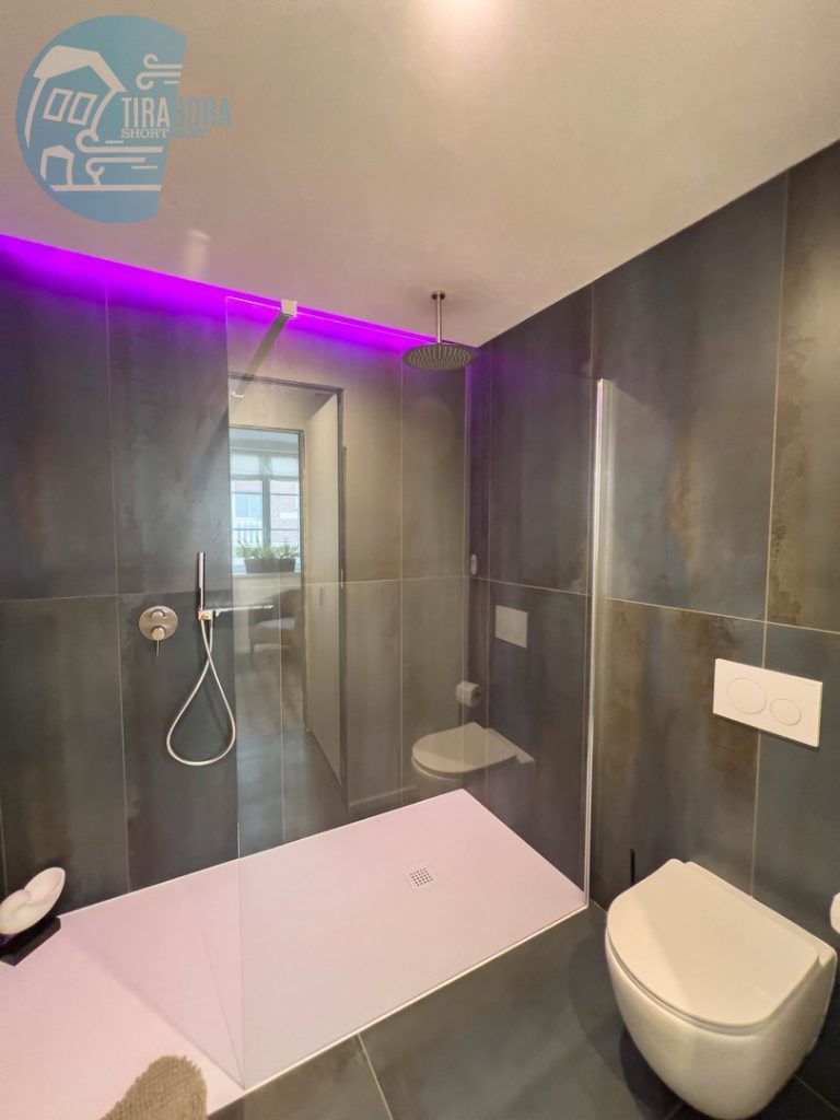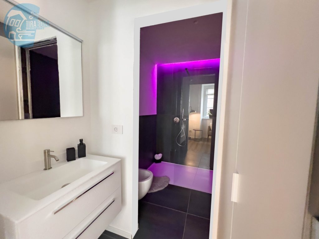 Ampio bagno con doccia walk-in, marmi a rivestire pareti e pavimento e soffuse luci led al soffitto, cucina completa di elettrodomestici e tutto l’occorrente per farvi sentire a casa e godere appieno del vostro rifugio durante il vostro soggiorno a Trieste.